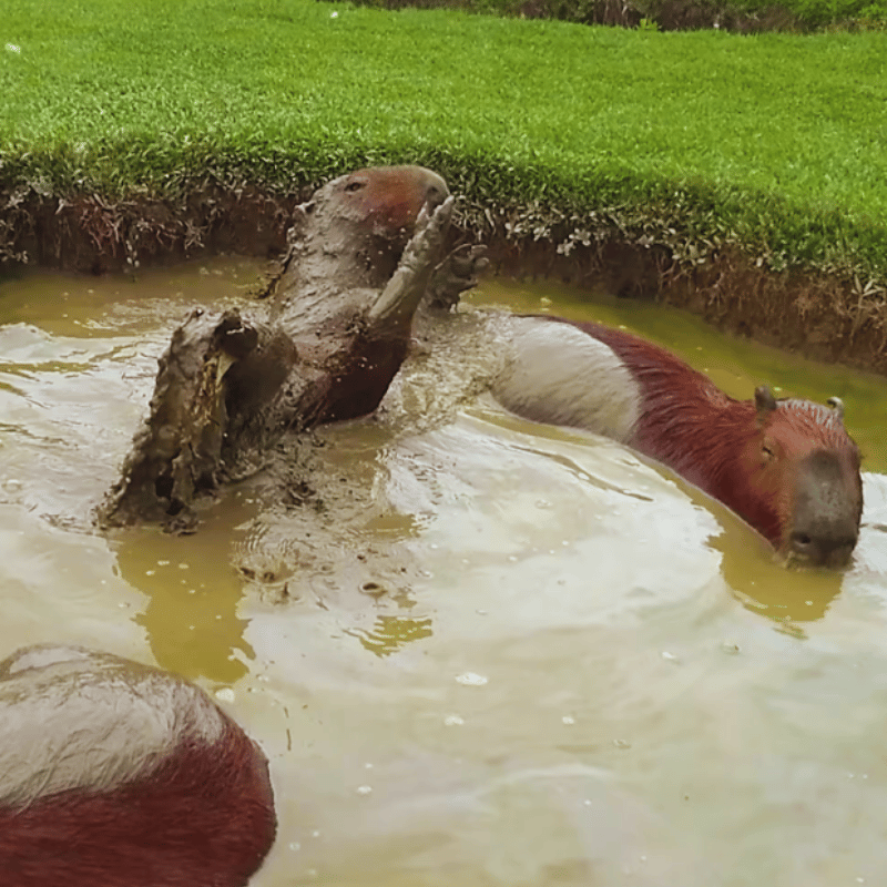 A good example being this athletic capy who jumped up out of the water and did a backflip (backflop?) back into the pond.