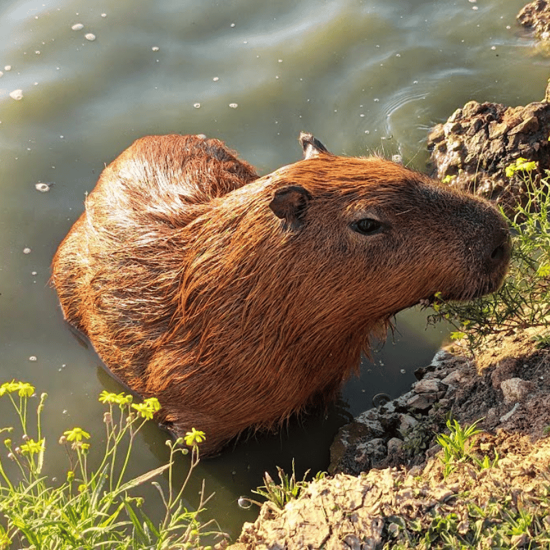 Here’s a picture of a Capybara relaxing in the lake near some bright yellow flowers.