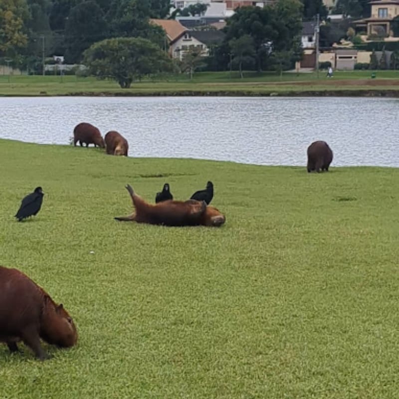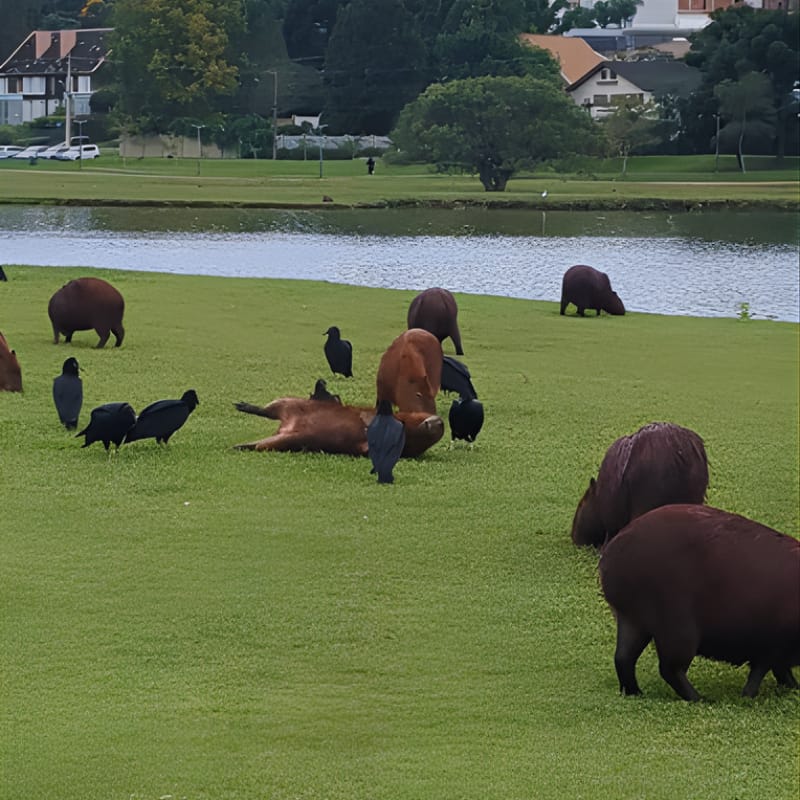 On a cold, rainy morning in Curitiba, I saw something unusual: all the Capybaras were gathered together and surrounded by dozens of vultures.