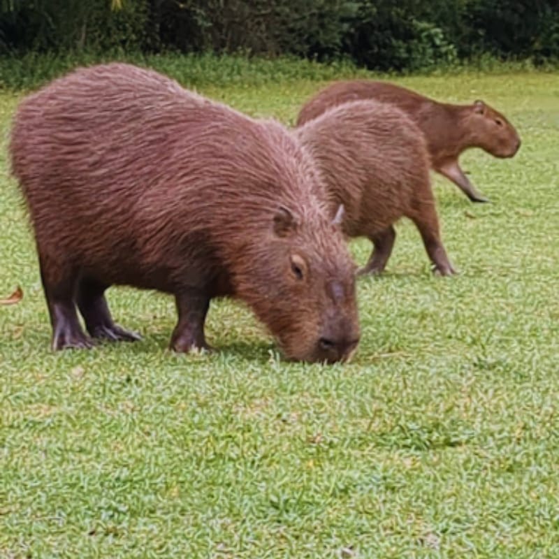 Here’s a stocky, muscular Capybara grazing with friends.