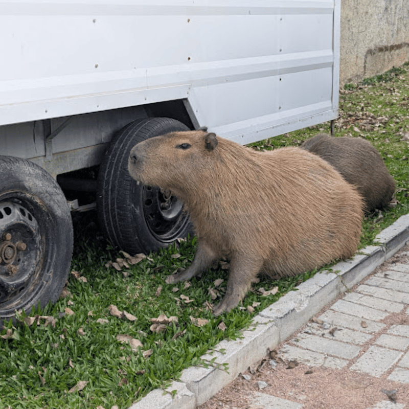 Here’s a Capybara — two of them, actually — grazing around a food truck near Barigui Park.