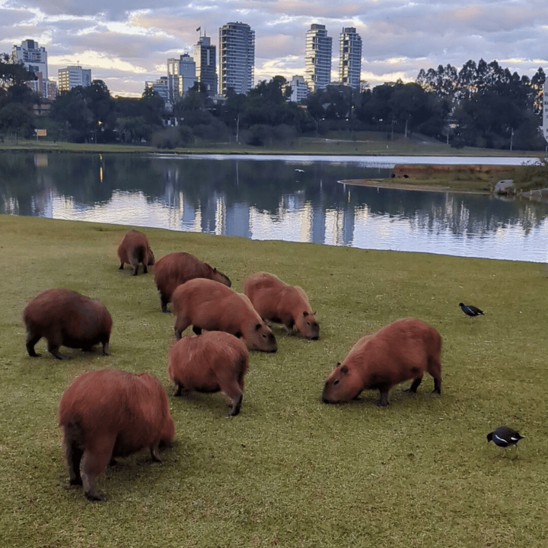 A big herd of capys grazing together as the sun sets in Curitiba!