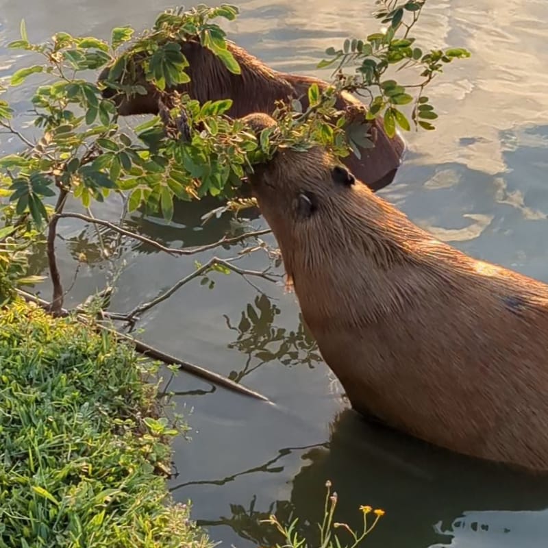 This Capybara had a similar idea, putting its cranium to good use as it bounced a tree branch up and down while keeping its legs firmly planted in the lake bed.