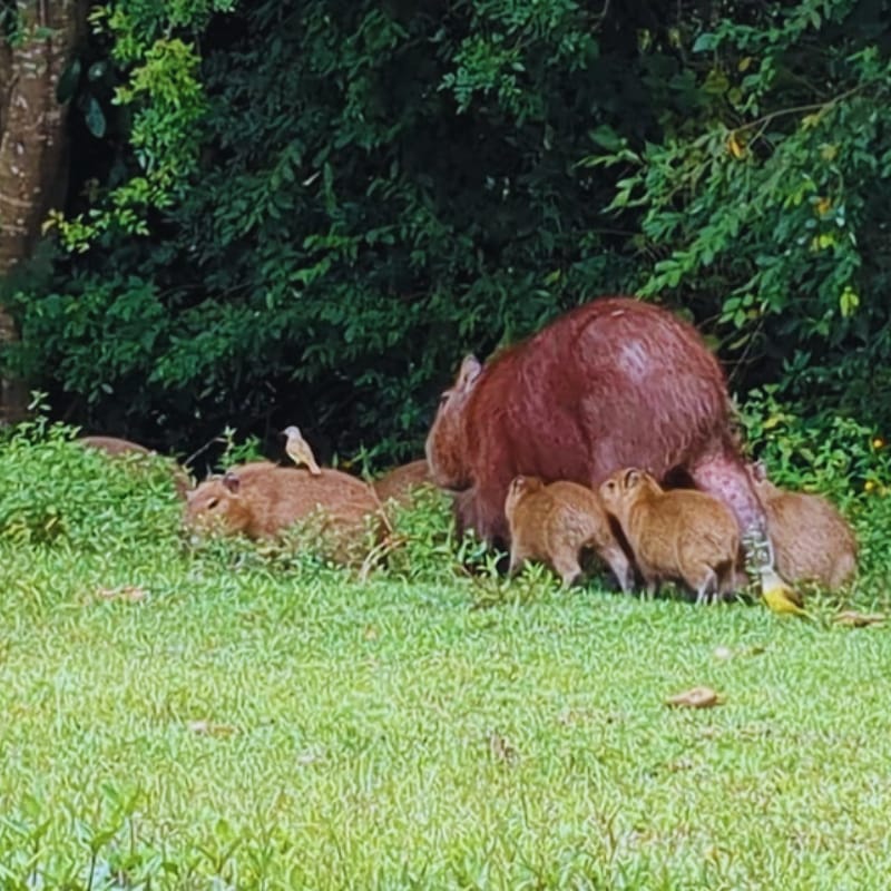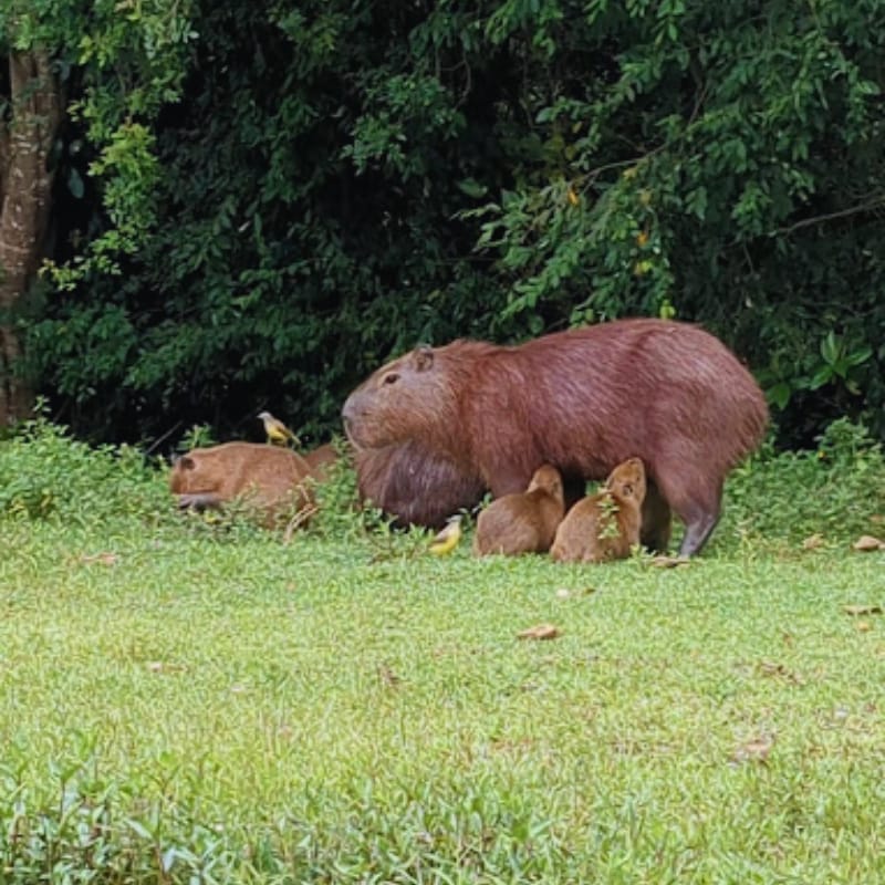 Here’s a mother capy guiding her little ones along the forest’s edge.