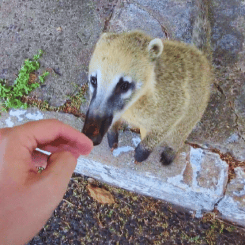 There was a waterfall at the edge of the city, and a lot of coatis were hanging out near the falls. Also, while hiking through the woods, a capuchin monkey followed me.