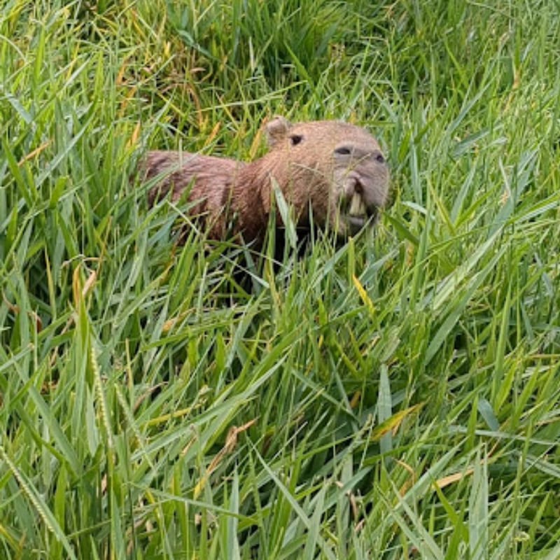 This Capybara was out in the tall grass enjoying a meal.