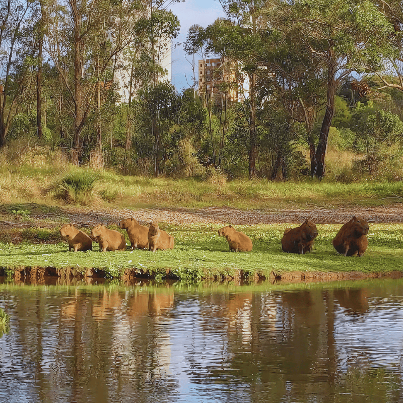 In fact, here’s a big family of capys relaxing on the river bank just outside the park’s perimeter.