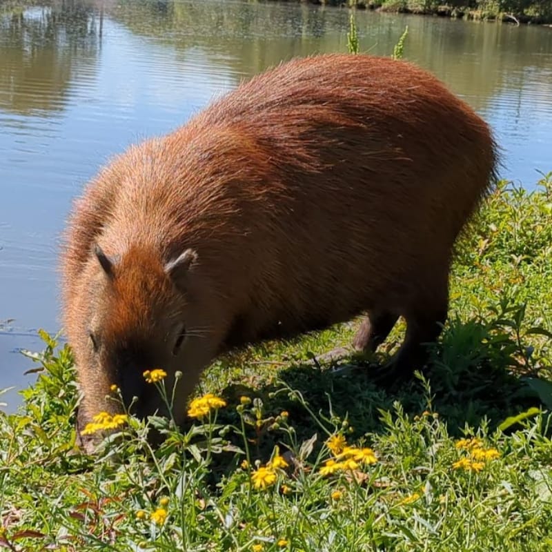 A tranquil moment by the water. Sunshine. Wildflowers. And, of course, a Capybara!
